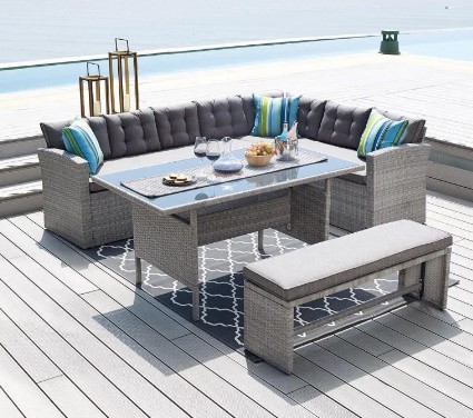 Предлагаем вам приобрести подушки, предназначенные для комплекта садовой мебели 210339, в комплекте находятся подушки для сидения и спинки, подушки для спинки прошиты при помощи пуговиц, данный комплект имеет серый цвет. Изготовлены подушки из полиэстера с мягким наполнителем. Предназначены подушки для скамьи, ширина которой составляет 120 см, глубина 35 см, а высота 39 см, а также для углов дивана, длина которого составляет 177 см, ширина 169 см, а глубина 67 см, высота 74 см.