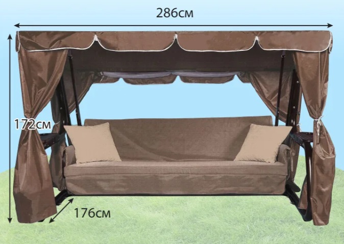 качелей может сильно трескаться и облазить, а металл в тот момент, когда он контактирует с водой, будет подвергаться воздействию коррозии. Кроме того, негативно повлиять на лакокрасочное покрытие могут и ультрафиолетовые лучи, в данном случае краска будет шелушиться и отпадать, а цвет не будет таким ярким. Кроме того, выгореть могут и мягкие элементы, они будут выглядеть не так привлекательно. Благодаря тенту, предназначенному для садовых качелей можно защитить качели от падающих веток и птичьего помёта, из-за чего летний отдых станет хуже. Качели, у которых есть тент, выглядят намного более привлекательно, что тоже является огромным преимуществом в пользу выбора тента. Также такой тент может продаваться вместе с противомоскитной сеткой, благодаря чему вы также будете защищены от насекомых, которые сильно могут омрачить летний отдых.